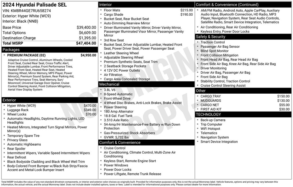 Premium Package (115-Volt AC Power Outlet, 12.3" Full-Digital Multi-Information Display, 3rd Row USB Outlets, Acoustic Rear Side Glass, Blind-Spot View Monitor, Driver 4-Way Power Lumbar Support, Forward Collision Avoidance Assist, Front Parking Sensors, harman/kardon® Audio System, Heated 2nd Row Seats, Heated Steering Wheel, Highway Driving Assist 2, HomeLink, Hydro-Phobic Front Side Glass, Integrated Memory Driver Seat & Mirrors, Option Group 02, Passenger Talk (In-Car Intercom), Power Sunroof, Rear Side Window Sunshades, Surround View Monitor, Ventilated Front & 2nd-Row Seats, and Wheels: 20" x 7.5J Alloy), Hyundai Certified Used Vehicles Certified, 3.510 Axle Ratio, 3rd row seats: split-bench, 4-Wheel Disc Brakes, 6 Speakers, ABS brakes, Air Conditioning, Alloy wheels, AM/FM radio: SiriusXM, Apple CarPlay & Android Auto, Auto High-beam Headlights, Auto-dimming door mirrors, Auto-dimming Rear-View mirror, Automatic temperature control, Brake assist, Bumpers: body-color, Cargo Cover/Screen, Cargo Net, Cargo Tray, Carpeted Floor Mats, Delay-off headlights, Driver door bin, Driver vanity mirror, Dual front impact airbags, Dual front side impact airbags, Electronic Stability Control, Emergency communication system, Exterior Parking Camera Rear, First Aid Kit, Four wheel independent suspension, Front anti-roll bar, Front Bucket Seats, Front Center Armrest, Front dual zone A/C, Front reading lights, Fully automatic headlights, H-Tex Leatherette Seat Trim, Heated door mirrors, Heated Front Bucket Seats, Heated front seats, Illuminated entry, Knee airbag, Low tire pressure warning, Mudguards, Navigation System, Occupant sensing airbag, Outside temperature display, Overhead airbag, Overhead console, Panic alarm, Passenger door bin, Passenger vanity mirror, Power door mirrors, Power driver seat, Power Liftgate, Power passenger seat, Power steering, Power windows, Radio data system, Radio: AM/FM/MP3 Audio System, Rear air conditioning, Rear anti-roll bar, Rear audio controls, Rear reading lights, Rear side impact airbag, Rear window defroster, Rear window wiper, Reclining 3rd row seat, Remote keyless entry, Roof Rack Cross Rails, Security system, Speed control, Speed-sensing steering, Split folding rear seat, Spoiler, Steering wheel mounted audio controls, Tachometer, Telescoping steering wheel, Tilt steering wheel, Traction control, Trip computer, Turn signal indicator mirrors, Variably intermittent wipers, Wheel Locks, and Wheels: 18" x 7.5J Painted Finish Alloy.