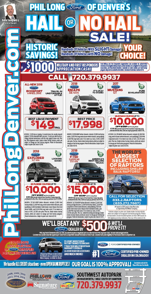 At Phil Long Ford of Denver our goal is to provide the best deals on new Ford cars and trucks that you can find. That's why we have different specials every month. You're likely to find special prices on such vehicles like the 2017 F150, 2017 Mustang, and more. Check out the deals that are available for this month below, then stop into our dealership for a test drive! If you have any questions you may email us or call us at 888-284-9077.