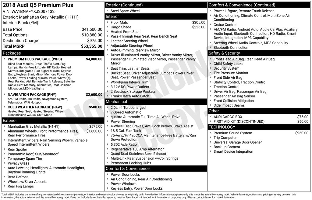 Cold Weather Package (3-Step Heated Rear Seats and Heated 3-Spoke Multifunction Steering Wheel), Premium Plus Package (3-Step Heated Front Seats, Audi Side Assist w/Pre Sense Rear, Full LED Headlights, High Gloss Window Surrounds, Panoramic Sunroof w/Tilt/Slide & Power Sunshade, Parking System Plus (Front/Rear Acoustic Sensors), Rear Cross Traffic Assist, SiriusXM All Access Service, Stainless Steel Door Sills, and Vehicle Exit Assist), Black Leather, 10 Speakers, 4-Wheel Disc Brakes, 5.302 Axle Ratio, 8-Way Power Front Bucket Seats, ABS brakes, Air Conditioning, All Weather Floor Mats, Alloy wheels, Audi Cargo Box, Audi Guard Protection Kit, Audi smartphone interface (Apple CarPlay/Android Auto), Auto-dimming Rear-View mirror, Automatic temperature control, Bang & Olufsen 3D Sound System, Black Privacy Trunk Cover, Brake assist, Bumpers: body-color, Cargo Mat, Compass, Delay-off headlights, Driver door bin, Driver vanity mirror, Dual front impact airbags, Dual front side impact airbags, Electronic Stability Control, Exterior Parking Camera Rear, Four wheel independent suspension, Front anti-roll bar, Front Bucket Seats, Front Center Armrest, Front dual zone A/C, Front fog lights, Front reading lights, Garage door transmitter: HomeLink, Genuine wood console insert, Genuine wood dashboard insert, Genuine wood door panel insert, Heated door mirrors, High intensity discharge headlights: Xenon plus, Illuminated entry, Leather Seating Surfaces, Leather Shift Knob, Leather steering wheel, Low tire pressure warning, Occupant sensing airbag, Outside temperature display, Overhead airbag, Overhead console, Panic alarm, Passenger door bin, Passenger vanity mirror, Power door mirrors, Power driver seat, Power Liftgate, Power passenger seat, Power steering, Power windows, Radio data system, Radio: MMI Navigation Plus System, Rain sensing wipers, Rear air conditioning, Rear anti-roll bar, Rear fog lights, Rear reading lights, Rear seat center armrest, Rear window defroster, Rear window wiper, Remote keyless entry, Roof rack, Security system, Speed control, Speed-sensing steering, Speed-Sensitive Wipers, Split folding rear seat, Spoiler, Steering wheel mounted audio controls, Tachometer, Telescoping steering wheel, Tilt steering wheel, Traction control, Trip computer, Turn signal indicator mirrors, Variably intermittent wipers, Wheels: 8" x 18" 5-Double-Spoke Dynamic Design, and Wheels: 8" x 20" 5-Spoke Segment Design.