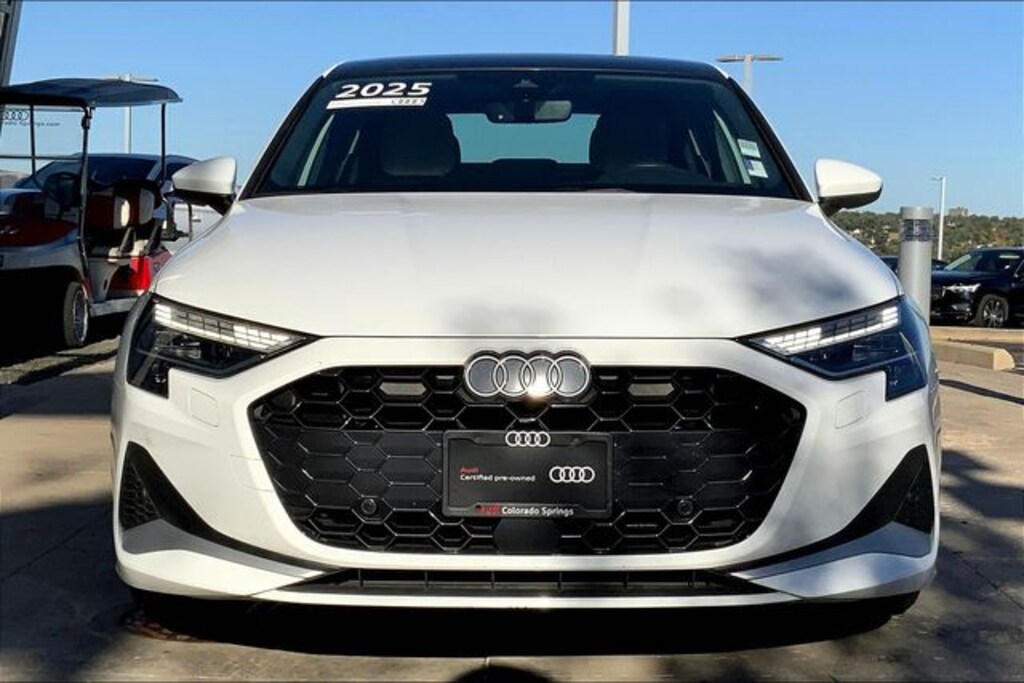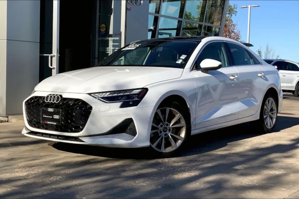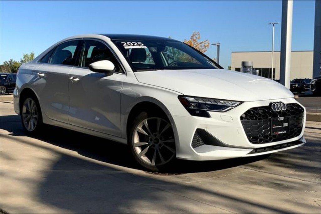 Arkona White 2025 Audi A3 40 Premium quattro quattro 7-Speed Automatic S tronic 2.0L 4-Cylinder TFSI quattro, Parchment Beige/Steel Gray Stitching w/Leather Seating Surfaces.