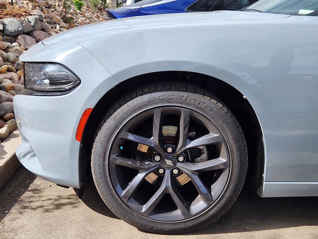 Blacktop Package (Black 1-Piece Performance Spoiler, Dodge Grille Badge, Gloss Black Fascia Applique, Gloss Black I/P Cluster Trim Rings, Satin Black Charger Decklid Badge, and Satin Black Dodge Tail Lamp Badge), Cold Weather Package (Exterior Mirrors w/Heating Element, Heated Front Seats, Heated Steering Wheel, and Power Heated Mirrors w/Man F/Away), Driver Convenience Group (Bi-Function HID Projector Head Lamps, Blind Spot Power Heated Mirror, Front LED Fog Lamps, and Universal Garage Door Opener), Quick Order Package 2EG, Black Cloth, 4-Wheel Disc Brakes, 6 Speakers, ABS brakes, Air Conditioning, Alloy wheels, AM/FM radio: SiriusXM, Anti-whiplash front head restraints, Apple CarPlay/Android Auto, Brake assist, Bumpers: body-color, Cloth Sport Seat, Compass, Delay-off headlights, Driver door bin, Driver vanity mirror, Dual front impact airbags, Dual front side impact airbags, Electronic Stability Control, Four wheel independent suspension, Front anti-roll bar, Front Bucket Seats, Front Center Armrest, Front dual zone A/C, Front reading lights, Fully automatic headlights, Illuminated entry, Knee airbag, Leather Shift Knob, Low tire pressure warning, Occupant sensing airbag, Outside temperature display, Overhead airbag, Overhead console, Panic alarm, ParkView Rear Back-Up Camera, Passenger door bin, Passenger vanity mirror, Power 8-Way Driver Seat, Power door mirrors, Power driver seat, Power steering, Power windows, Radio: Uconnect 4 w/7" Display, Rear anti-roll bar, Rear Armrest w/Cupholder Seat, Rear reading lights, Rear seat center armrest, Rear window defroster, Remote keyless entry, Speed control, Speed-Sensitive Wipers, Split folding rear seat, Steering wheel mounted audio controls, Tachometer, Telescoping steering wheel, Tilt steering wheel, Traction control, Trip computer, Variably intermittent wipers, Wheels: 17" x 7.0" Painted Cast Aluminum, and Wheels: 20" x 8.0" Black Noise Painted.