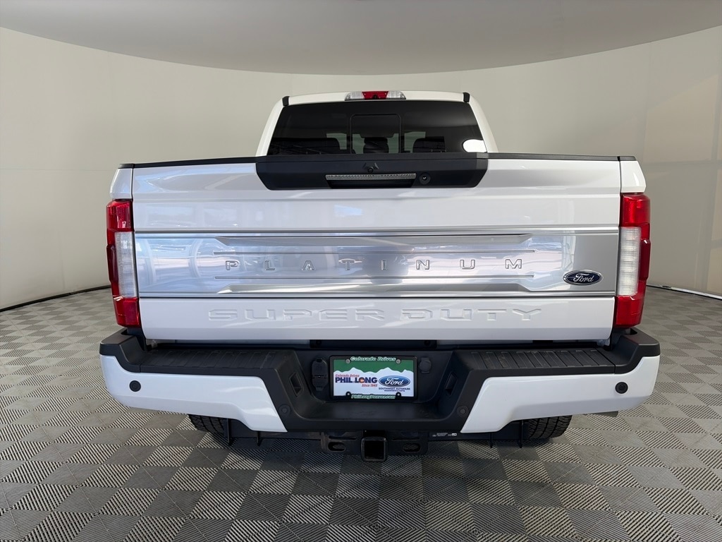 ENGINE: 6.7L POWER STROKE V8 TURBO DIESEL B20 4 valve OHV, manual push-button engine-exhaust braking and intelligent oil-life monitor, Extra Heavy-Duty 220 Amp Alternator, 3.55 Axle Ratio, 34 Gallon Fuel Tank, GVWR: 11,500 lb Payload Package, Dual 78-AH 750 CCA Batteries, PLATINUM ULTIMATE PACKAGE Adaptive Cruise Control & Collision Warning, brake support, Ultimate Trailer Tow Camera System, 360 degree camera system and trailer reverse guidance, NOTE: Does not include customer placed trailer camera, Rear CHMSL Camera, Display in center stack screen, LED Center High-Mounted Stop Lamp (CHMSL) w/cargo light and rear video camera, Lane-Keeping Alert, Twin Panel Power Moonroof, map lights and moonroof switches, ELECTRONIC-LOCKING W/3.55 AXLE RATIO, TRANSMISSION: TORQSHIFT 6-SPEED AUTOMATIC (6R140), SelectShift. Ford Platinum with White Platinum Metallic Tri-Coat exterior and Black/Brunello interior features a 8 Cylinder Engine with 440 HP at 2800 RPM*.