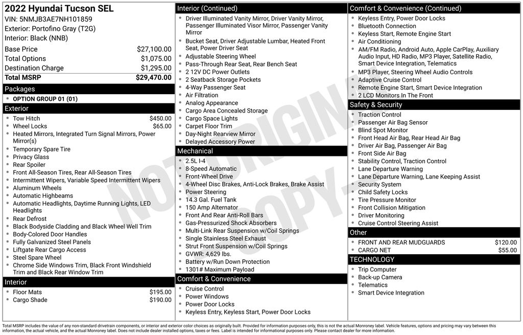 Option Group 01, 3.648 Axle Ratio, 4-Wheel Disc Brakes, 6 Speakers, ABS brakes, Air Conditioning, Alloy wheels, AM/FM radio: SiriusXM, Apple CarPlay & Android Auto, Auto High-beam Headlights, Brake assist, Bumpers: body-color, Cargo Cover, Cargo Net, Carpeted Floor Mats, Delay-off headlights, Driver door bin, Driver vanity mirror, Dual front impact airbags, Dual front side impact airbags, Electronic Stability Control, Emergency communication system: Blue Link Connected Car Service (3-year complimentary subscription), Four wheel independent suspension, Front and Rear Mudguards, Front anti-roll bar, Front Bucket Seats, Front Center Armrest, Front reading lights, Fully automatic headlights, Heated door mirrors, Heated Front Bucket Seats, Heated front seats, Illuminated entry, Low tire pressure warning, Occupant sensing airbag, Outside temperature display, Overhead airbag, Overhead console, Panic alarm, Passenger door bin, Passenger vanity mirror, Power door mirrors, Power driver seat, Power steering, Power windows, Radio data system, Radio: AM/FM/HD/SiriusXM Audio System, Rear anti-roll bar, Rear seat center armrest, Rear window defroster, Rear window wiper, Remote keyless entry, Roof rack: rails only, Security system, Speed control, Split folding rear seat, Spoiler, Stain & Odor Resistant Cloth Seat Trim, Steering wheel mounted audio controls, Tachometer, Telescoping steering wheel, Tilt steering wheel, Tow Hitch, Traction control, Trip computer, Turn signal indicator mirrors, Variably intermittent wipers, Wheel Locks, and Wheels: 17" x 7.0J" Alloy.