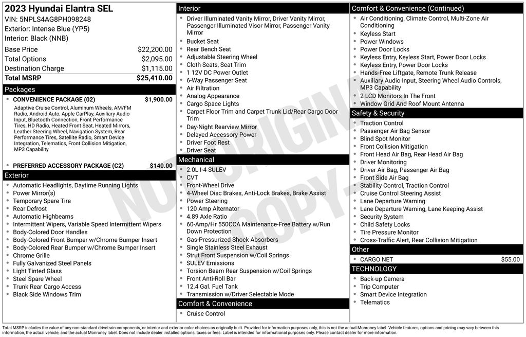 Convenience Package, Preferred Accessory Package (Cargo Side Bins, First Aid Kit, and Trunk/Cargo Hook), 16" x 6.5J Alloy Wheels, 4-Wheel Disc Brakes, 6 Speakers, ABS brakes, Air Conditioning, Alloy wheels, AM/FM radio: SiriusXM, Apple CarPlay & Android Auto, Auto High-beam Headlights, Automatic temperature control, Brake assist, Bumpers: body-color, Cargo Net, Cloth Seat Trim, Delay-off headlights, Driver door bin, Driver vanity mirror, Dual front impact airbags, Dual front side impact airbags, Electronic Stability Control, Emergency communication system: Blue Link Connected Car Service (3-year complimentary subscription), Exterior Parking Camera Rear, Front anti-roll bar, Front Bucket Seats, Front Center Armrest, Front dual zone A/C, Front reading lights, Front wheel independent suspension, Fully automatic headlights, Illuminated entry, Low tire pressure warning, Occupant sensing airbag, Outside temperature display, Overhead airbag, Overhead console, Panic alarm, Passenger door bin, Passenger vanity mirror, Power door mirrors, Power steering, Power windows, Radio: AM/FM/HD/SiriusXM Display Audio, Rear window defroster, Remote keyless entry, Security system, Speed control, Speed-sensing steering, Steering wheel mounted audio controls, Tachometer, Telescoping steering wheel, Tilt steering wheel, Traction control, Trip computer, and Variably intermittent wipers.