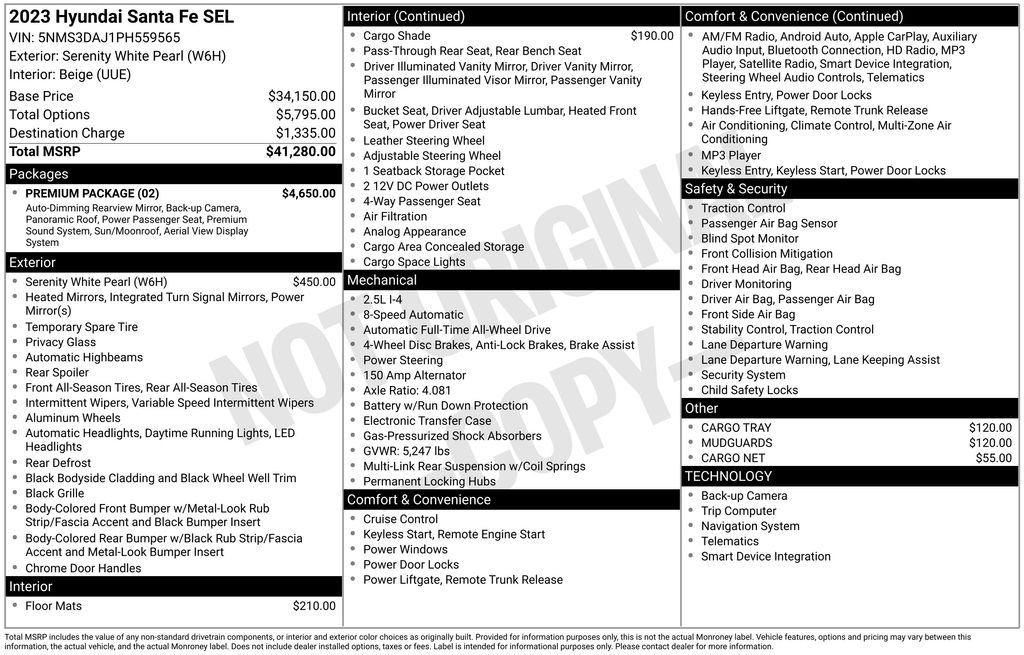 Premium Package (12.3" LCD Multi-Information Display, 8-Way Power Passenger Seat, Acoustic-Laminated Front Side Windows, Auto-Dimming Rear-View Mirror, Blind-Spot View Monitor, Chrome Front & Rear Bumper Accents, Chrome Interior Accents, H-Tex Leatherette Seat Trim, harman/kardon® Audio System, LED Interior Lights, LED Taillights, Manual Rear Side Sunshades, Option Group 02, Panoramic Sunroof, Power Release 2nd Row Seats, Silver Front Grille, and Surround View Monitor), AWD, Beige Artificial Leather, 18" x 7.5J Alloy Wheels, 4-Wheel Disc Brakes, 6 Speakers, ABS brakes, Air Conditioning, Alloy wheels, AM/FM radio: SiriusXM, Apple CarPlay & Android Auto, Auto High-beam Headlights, Automatic temperature control, Axle Ratio: 4.081, Brake assist, Bumpers: body-color, Cargo Cover/Screen, Cargo Net, Cargo Tray, Carpeted Floor Mats, Delay-off headlights, Driver door bin, Driver vanity mirror, Dual front impact airbags, Dual front side impact airbags, Electronic Stability Control, Emergency communication system, Exterior Parking Camera Rear, Four wheel independent suspension, Front anti-roll bar, Front Bucket Seats, Front Center Armrest, Front dual zone A/C, Front reading lights, Fully automatic headlights, Heated door mirrors, Heated Front Bucket Seats, Heated front seats, Illuminated entry, Leather steering wheel, Low tire pressure warning, Mudguards, Navigation System, Occupant sensing airbag, Outside temperature display, Overhead airbag, Overhead console, Panic alarm, Passenger door bin, Passenger vanity mirror, Power door mirrors, Power driver seat, Power Liftgate, Power steering, Power windows, Radio: AM/FM Display Audio, Rear anti-roll bar, Rear seat center armrest, Rear window defroster, Rear window wiper, Remote keyless entry, Security system, Speed control, Speed-sensing steering, Split folding rear seat, Spoiler, Stain-Resistant Cloth Seat Trim, Steering wheel mounted audio controls, Tachometer, Telescoping steering wheel, Tilt steering wheel, Traction control, Trip computer, Turn signal indicator mirrors, and Variably intermittent wipers.