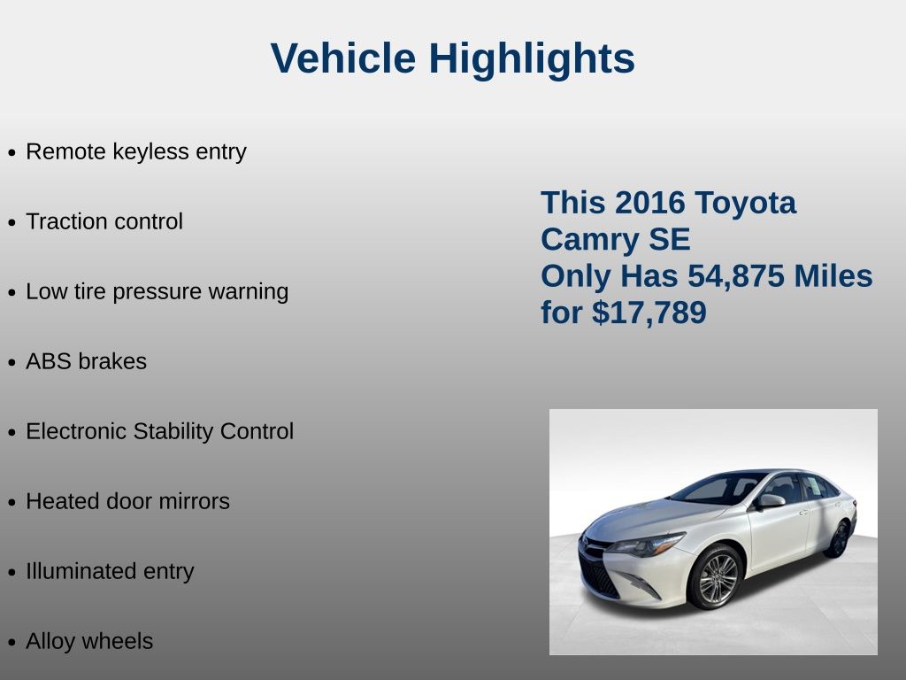 Odometer is 53327 miles below market average! White 2016 Toyota Camry SE FWD 6-Speed Automatic 2.5L I4 SMPI DOHC 25/35 City/Highway MPG